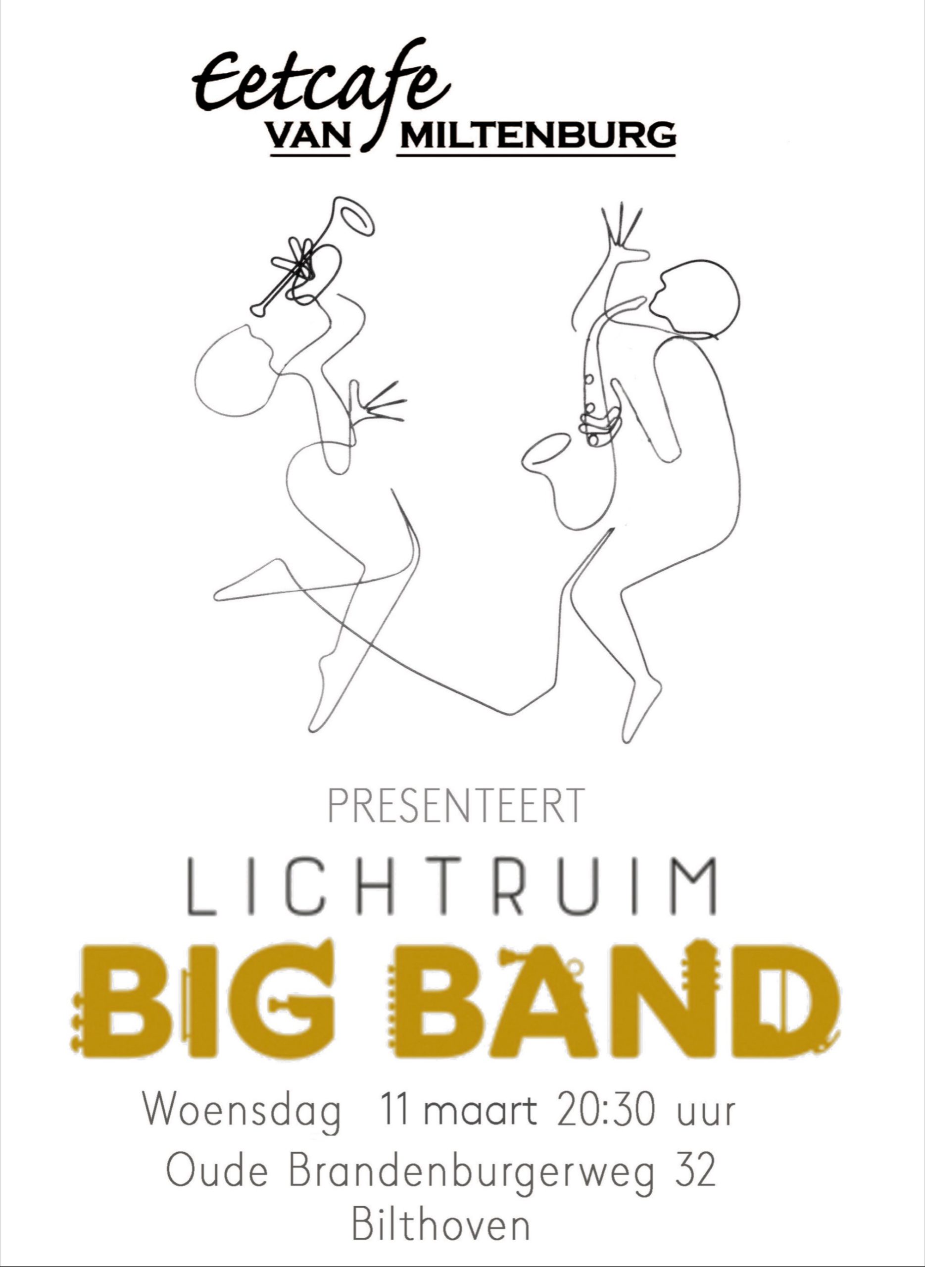 De Lichtruim Bigband treedt weer op! In het repertoire hoor je klassiekers zoals In The Mood van Joe Garland en Rock Around The Clock van Max C. Freedman en Jimmy DeKnight, maar ook nieuwere nummers zoals Chameleon, Kansas City en I Heard It Through The Grapevine. Met onze muziek swingen we ongeveer 1 uur, dus kom vooral luisteren onder genot van een lekker drankje!